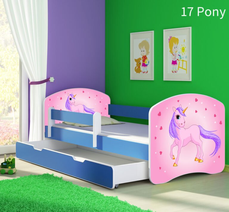 Dječji krevet ACMA s motivom, bočna plava + ladica 140×70 cm 18 Pony on a rainbow